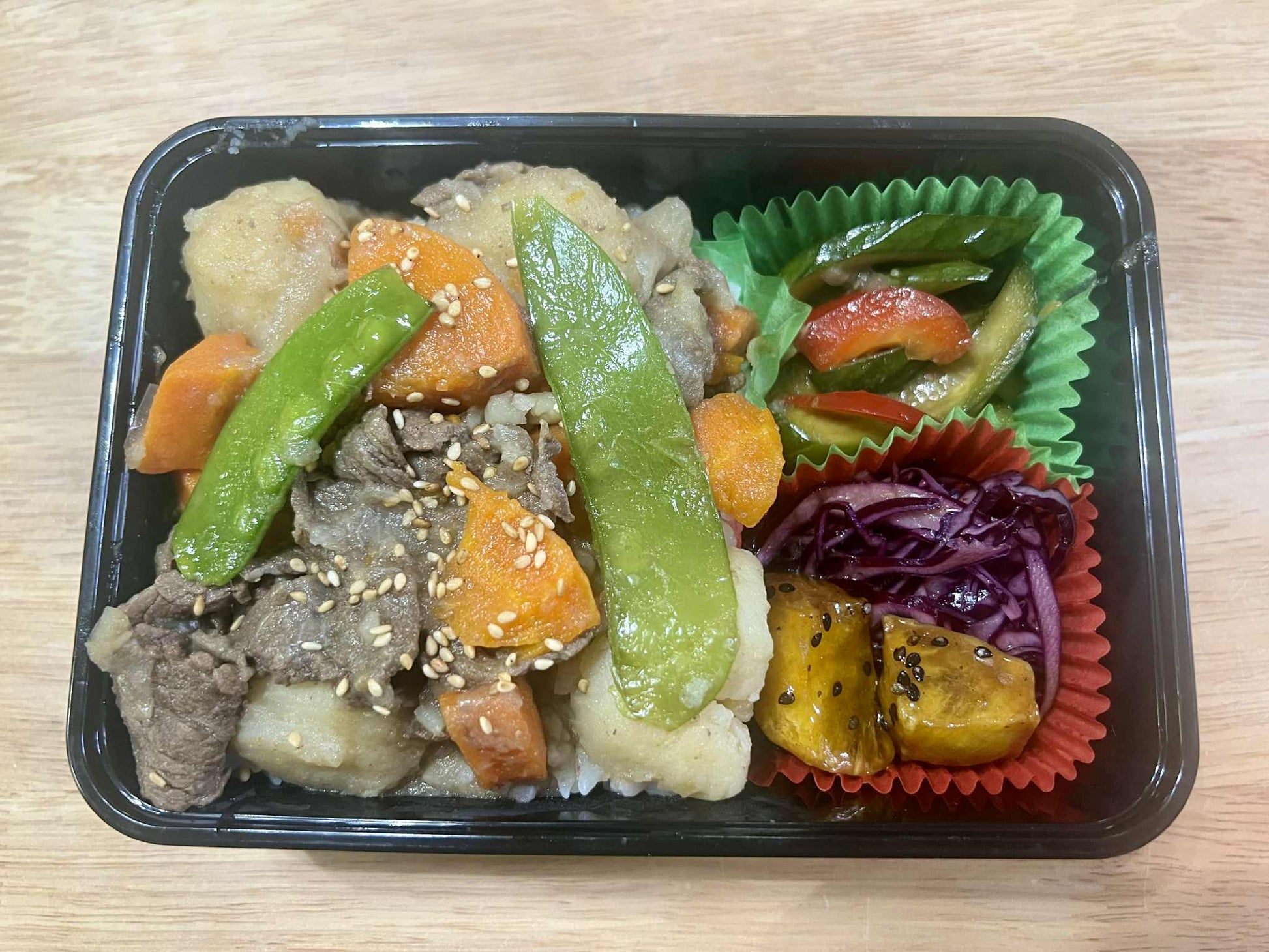 beef, potato, onion, carrots, snow pea, soy sauce, sugar, bonito stock