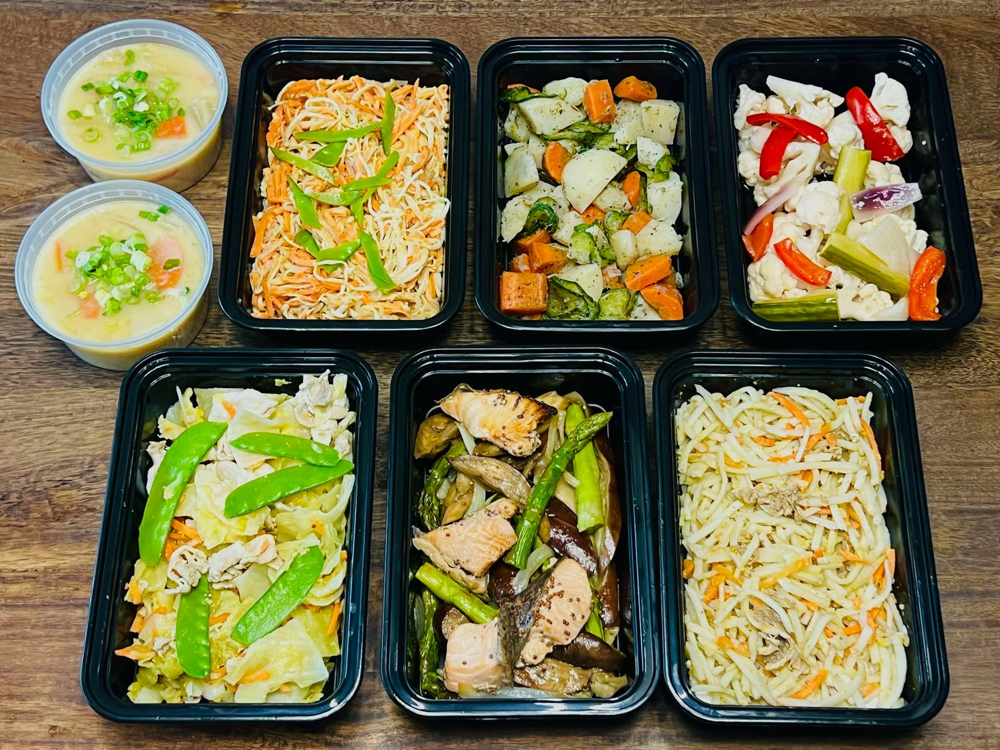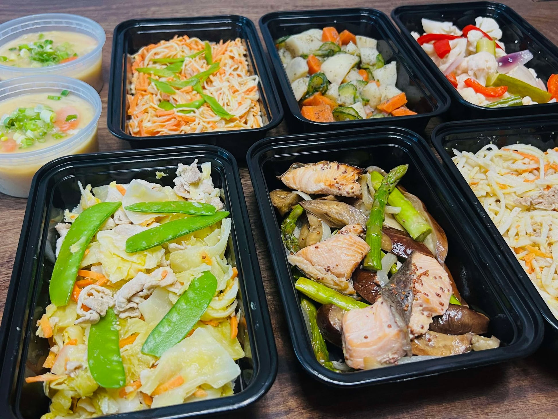 主菜3品(32 oz)、副菜3品(32 oz)、味噌汁などのスープ1品(16 ozx2)。$80のコンテナデポジットは不要。
