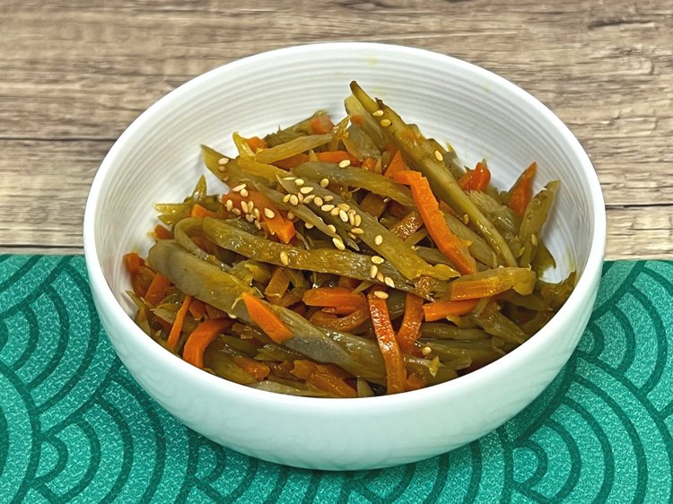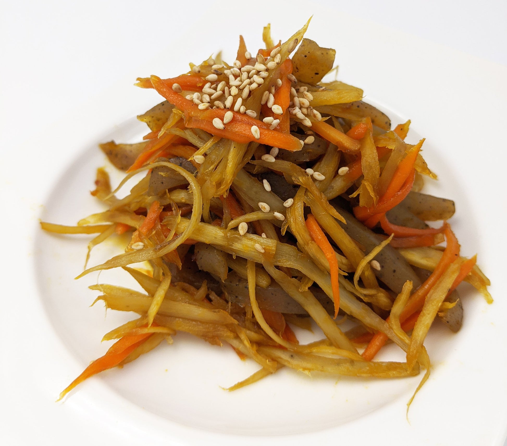burdock, carrots, soy sauce, sugar, mirin, sake, sesame oil, sesame oil